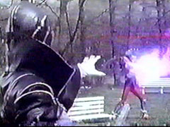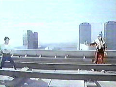 | Kujaku then transforms into a pacock and blasts Gara. | They seem to be eveningly matched. The Dairanger arrive and watch. |
