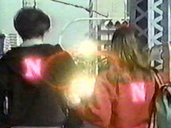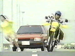 | She is being cashed by a car under the monster's control, Shouji leaps hi motorcycle over it. | He lures the car away from her, since he is still under the magnet control. |