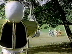 | He transforms with the Kiba Changer and his body becomes adult-size, dons helmet and sheild. | The daylight returns and as the Kibaranger, Kou bounces around the forest using his new abilities, such as blowing up rocks. |