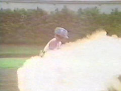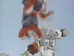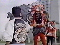 | Miss Telephone gets a 'ball' and ends up in first base and Gravestone on second base. | General Kamikaze hits a homerun that hits most of the Dairanger before it goes out of the park. Kamikaze mounts his motorbike. |