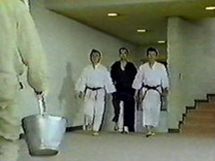 Martial Art students practice and a master comes into the room. A janitor drops a mop in the master's way. | The Janitor beats up two of his students and shows the master a coin and flips it. The coin drops and the master is dead. |