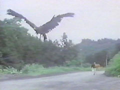 Shouji then spots a little girl being chased by the vulture. The vulture plucks the girl into the air. Shouji rescues the girl. | Shouji and the girl run from the vulture and enter the telephone booth and the booth is carried away by the vulture. |
