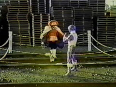 Miss Telephone then released telephone cords... | to create a boxing ring and flew in with her cape saying "Cuty Pink." |