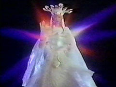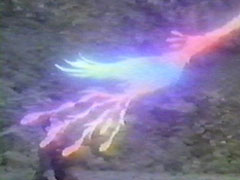| The Dairanger look up sadly as Daigo clutches his feather and her earing. | Kujaku ascended to Heaven, in a beautiful white dress. She says goodbye. |
