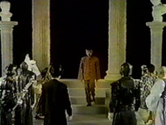 One of the Gorma throw a tomato on Akomaru, dropping him on the floor. They all laugh at him. | They start chanting then as Shaddam smirks. Akomaru runs off. Master Kaku then shows his presence. Shaddam and he stare at each other. |