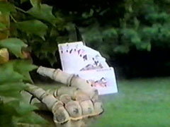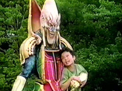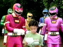 | watches from a tree. The Carranger arrives. They thank him and make symbols of their friendships (thumbs up). He is touches and lowers his letter.Signalman and Red shakes hands. Ichitarou then pops out of his hiding place. Suddenly, Zelmoda's hand pops out | of a bush with seven game cards. Before Ichitarou and Signalman reach each other, they are blasted at. Zelmoda grabs the boy hostage. Signalman comes at the foe but he threatens the child's life. He telports them away. Everyone is shocked. |