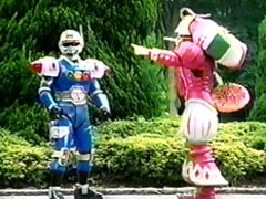 | Dappu ducks when he sees Signalman. He goes off. The others question Signalman about his home planet, while Natsumi fixes the Polispeeder. Suddenly, Dappu is banging a pan in a disguise outside of the garage, alerting about a Bowzock attack. | Signalman wonders who that is. Natsumi continues fixing the Polispeeder. Dappu ducks in through the side-door to check if they transform yet. He then makes the Polispeeder starts work again. Signalman jumps on it and exits, as Natsuki checks her |