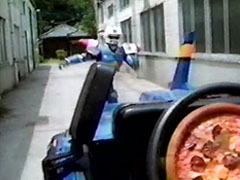 | pizza from the officer. When Signalman turns, he accidently shows it and then hides it. He tricks him into thinking evil pizzas are running amok. He imagines pizzas roll down the street, cover a street sign and a light signal. He leaves and the Carrangers | arrive. He throws exploding and flying pizzas at them. They are thrown to another area, warehouses. The Wild Cars arrive and shoot XX Milenno. He throws pizzas onto the cars' steering wheels and hubcaps, turning their headlights green and the cars |