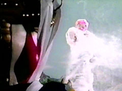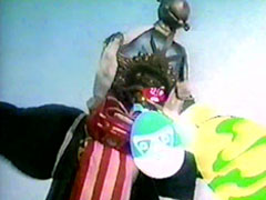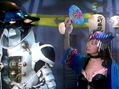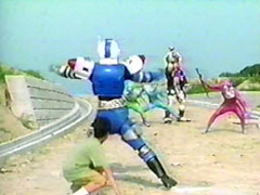 | the foe. HH Wasshoishoi eats imo-youkan and grows bigs. The Carranger notice this and is about to call their vehicles, when the monster shoots down rays (that look like easter eggs decorated as wumpers) towards Signalman and Ichitarou. RV Robo punches | him. They fight. He sprays a silly string-like foam on them that causes them to spin and coats them. Signalman calls for Sirender and punches the foe down. He then uses its knives to cut his friends out. They thank him and Sirender slashes the monster. |