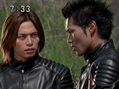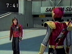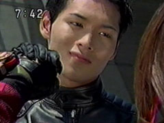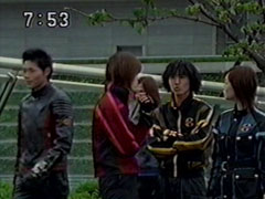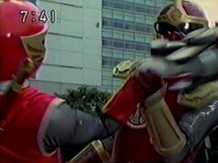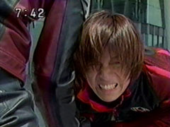 | Red falls on his back, but he slowly pulls himself saying that they became the Hurricanger but that's not the only reason they fight. Thus distresses Ikkou. Kangaruretto hits him with a hard punch. But he gets back up, continuing his speech. | Oboro watches the battle worried and sends a code to his Hayate blade. Red gets up again when he sees a new symbol appear on his blade. Red shatters the attack, slashes him and drops him. They get their combo weapons together. |