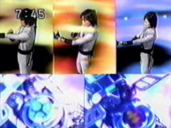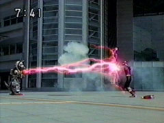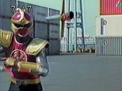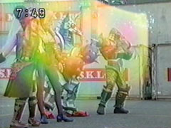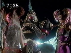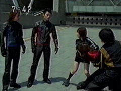 | Their enemies gather, the three lead Jakanja to support their man. They form the rainbow-tinted elegant barrier again. Yousuke agrees worriedly they probably can't break through. Ikkou suggests putting the Gadgets together. | They form the Victory Gadget, they destroy the barrier. the Hurricanger go into happy victory dance. The three Jakanja leaders are staggering back to their feet and look down in shocked fury at the wreckage of Kangaruretto. |