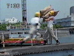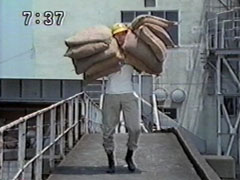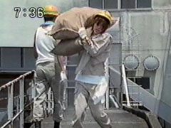 | He nearly topples over as he dumps them onto the pile, a man there says to make sure they're tidy enough to work with. Yousuke turns, and both of them gape. Ikkou is walking calmly towards them, and now carrying five bags. | Yousuke ends up staggering under the weight of 6 bags that you can barely see his head between. He makes it to the pile and nearly falls down. Ikkou is returning at the same calm pace... carrying 10 bags! Yousuke passes him with a resentful glare. |