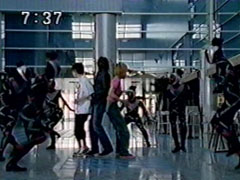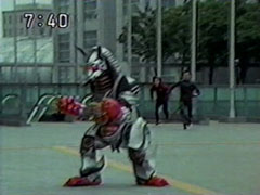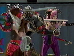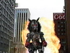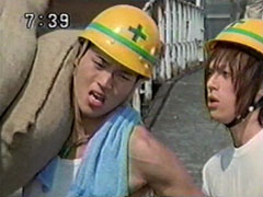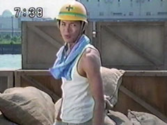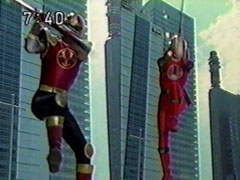 | The foe findsYousuke and Ikkou, whom have arrived via the escalators behind him. Ikkou calls his brother while Yousuke calls his pals. The enemy starts again to pound on the ground, staggering them. He does one fierce blow that knocks them into the | air to land hard. Yousuke says that they'll have to hold him until the others get there. To his relief, Ikkou's all for it. Together they transform quickly and strike the foe. He sends fire towards them. Yousuke attacks with his Hurricane Shuriken. |