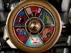 | When Yousuke is out of sight, Ikkou's face lights up. A trio of young men are walkingthrough a mall. They suddenly find themselves surrounded by Magerappa, who corner them against a pillar. Kangaruretto arrives. He has a roulette wheel on his | chest: six symbols-- Earthquake, lightning, fire, angry man, hot lava, a bomb. He orders them to stop the roulette. The Magerappa push them towards him. They are given a remote control to press a red button. The bleached haired boy presses it. |