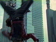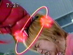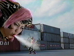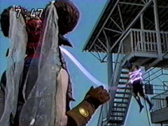 | Ikkou turns at his brother's cry of pain only to find Wendinu's blade hovering in the air . Wendinu gestures, and its attack sends him tumbling. He uses his staff in cross form and blasts at her, but she diappears. He looks frantically around. He ducks when | her giant foot kicks. He dives to avoid her hand and then her faceblows a stream of air. Yousukegets smashed through the window of a car by Kangaruretto at the same time as Wendinu issmashing Ikkou on the trunk of another car repeatedly. |