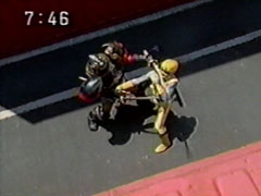 | Kangarurettofalls. They watch their enemy run. Yousuke is admiring of Ikkou and un-transforms. He asks why he stopped him before. Ikkou un-transforms and explains that lightningisthe Goraijer's field of battle. Yousukefeels hurt and expresses | it. So Yousuke asks seriously if Ikkou really meanshis insults. He says he doesn't usually answer anything that isn't true. Finally he's had enough and throws a punch, but Ikkou catches it effortlessly. He kicks the boy's feet out from under him. |