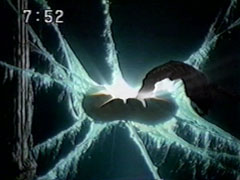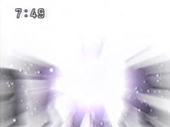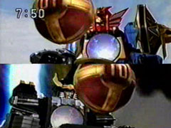 | Wendinu calls for the Copy Giant. The two teams form their respective robots quickly. Both robotscall forth their Sword Slashers. The foe punches them back, calls upon his Fire power and hits them badly. Oboro tells the leaders to form Goraisempujin. | They obey without hesitation, calling for Furai Maru and destroy Kangaruretto. Manmaruba's cocoon cracks open with shining, white light. First out comes what looks like the twisting tail, but then is clearly a humanoid shape. |
