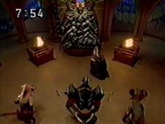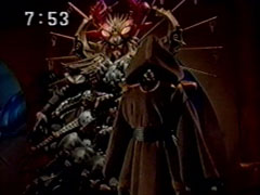 | The trio slowly realize that they are being appreciated. Ahead of them, Isshu asks Ikkou he is now being nice to him. Ikkou can't help but grin and laugh. Sargain arrives home, to find a stranger in brown cloak who mocks him mildly. | He steps forward and takes off his hood to reveal his head. They are shocked to find he is Manmaruba. Tao Zanto speaks, something about the need for six. The four kneel before him. Tao Zanto re-states his determination to rule the Earth. |