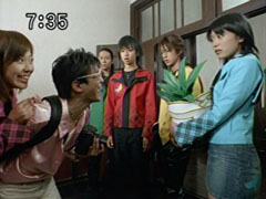 | Houka arrives late once again, but with a big announcement. Showing them a wedding ring-- she's getting married. Everyone has a delayed big reaction. At the front door, they are introduced to Tetsuya, who takes pictures of them all. | Last to be introduced is Makito. He is the most mad. Tetsuya and Houka met at work. They say they were waiting for each other. they are serious about getting married, the wedding is even the next day. Makito steams up red, surprising everyone. |