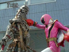 | But Makito doesn't let him. Skeleton brings down an entire building and MagiPink fights him alone. She calls for MagiPunch and avoid his blasts and knocks him away. He collapses into pieces when the others arrive. His skull glows. | And he is rebuilt. He shoots MagiPink down and she un-transfoms. She says she is not giving up. She wants to tell Makito something but he refuses, saying even though she did a little work, doesn't mean he will condone the marriage. |