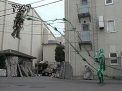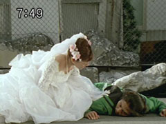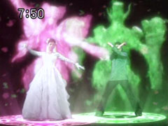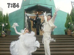 | Houka is happy with Makito's approval via Tetsuya. They are surprised he didn't come, Houka expects the worst. MagiGreen fights Skeleton and brings him up with vines and then lets him go to split up. He rebuilds and blasts him down. | The wedding march starts, Houka is at the end of the aisle and starts walking. She thinks of her brother. Their phones ring and echo. It is Mandora-Boy, breaking his promise. He shows Houka the image of Green being beat up. |