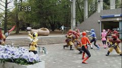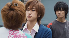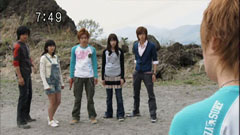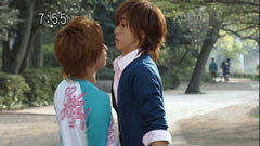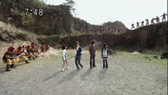 | Later, the gang apologize to Chiaki. Chiaki says everything is alright. Ryu thinks that Chiaki is placating him and asks him to hit him. They scuffle and then actually get in each other's faces. | Takeru gets in between them and says they get along so well that they feel comfortable feeling. They both laugh and everyone runs after Takeru and walk alongside him in victory. |