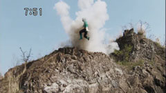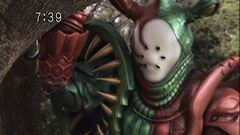 | Chiaki tells him he saw his reflection in the water under the bridge andsent a text the others telling them to meet him at the mountain. Ryu didn't believe him. Takeru ordered them to go. In real time, the monster shows his true face. | The five henshin and roll-call. They fight him and then the monster mimics Red's appearance. The monster takes his true form and attacks the five. Green then fights one-on-one with him. He leaps on the mountain and is brought down. |