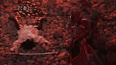 | "Kotoha" comes up to him and apologizes. Chiaki lets his guts spill. He thinks anything he does is no good. Kotoha follows him. Chiaki says he thought Ryu of as a comrade. Kotoha turns into the monster. | He is about to strike with his sword but when Chiaki looks up and sees Kotoha. He says Takeru has a way to seal Douku and that they are going to gather at Mt. Kurogane. He sends her off and behind the bushes, she becomes the foe. |
