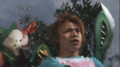 | He bids them goodbye and leaves. Afterwards, they can't find him. Chiaki returns with his head injury and the gang scolds him. Kotoha asks if it was a joke. Chiaki doesn't know what he's talking about, Ryu is mad and knocks him down. | Takeru finds the device Chiaki made with the swords on a tree and they leave. Chiaki is confused. Another Chiaki behind a tree becomes the monster and he laughs. In the house, Kotoha says something is off. |