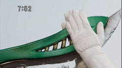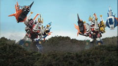 | Chiaki closes his eyes as the foe lowers his sword and finally catches it and with his foot as well, knocking the villain down. He then uses his elemental attack. Red and Green use the Kabuto ring with the cannon and take the first life down. | The foe grows and TenkuShinkenOh fights him. He mimics their look an dlaughs. Blue and Yellow can't tell the difference. Green wakes them up that they are inside the real one. Green makes the robot fly and they conduct the finisher, destroying the foe. |